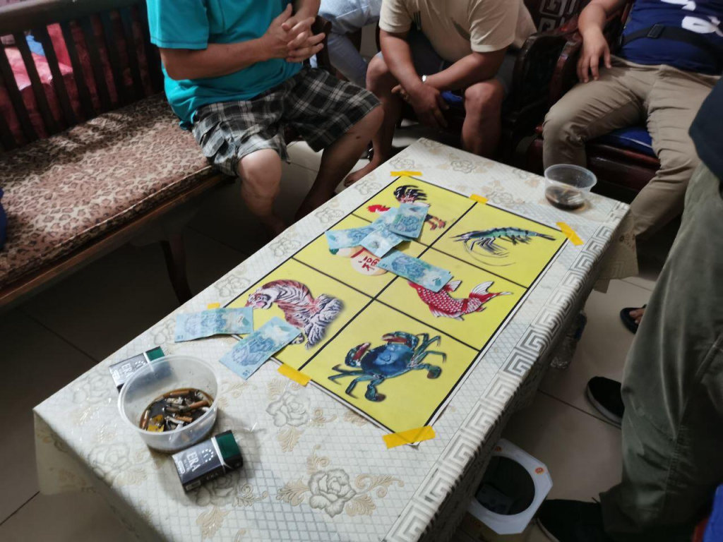 Melalui serbuan itu juga, pihak polis telah berjaya merampas beberapa peralatan yang dipercayai digunakan untuk menjalankan kegiatan perjudian seperti dadu, wang tunai, kain untuk permainan katam-katam dan kong (tempat penyimpanan dadu permainan).