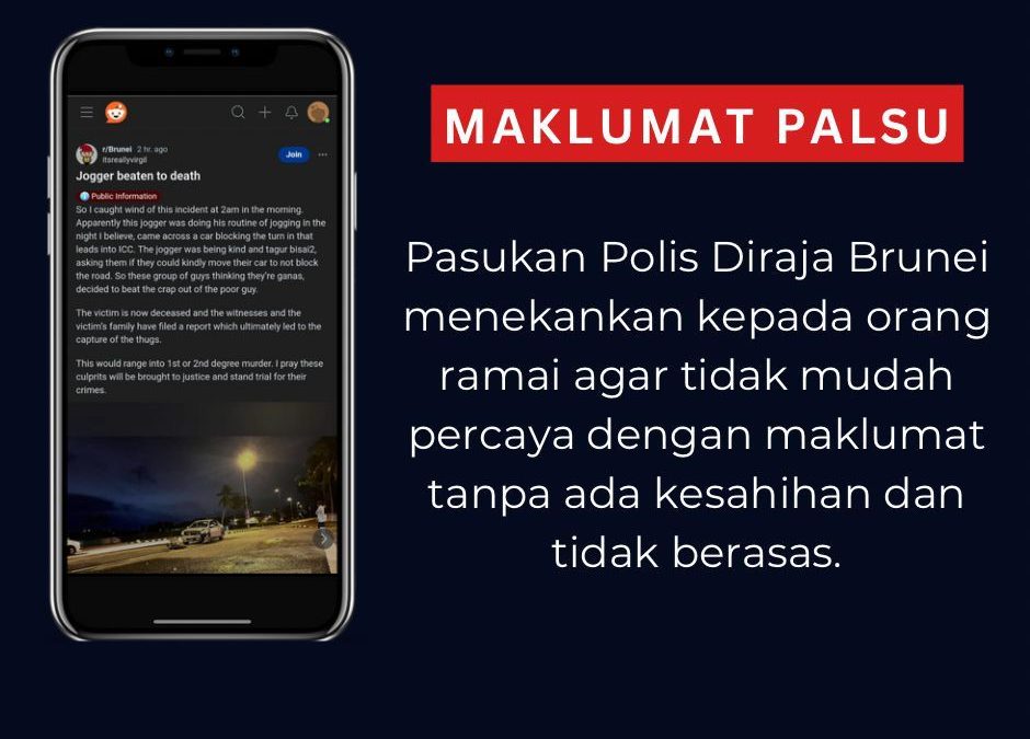 GADONG, Isnin 20 Mei 2024 – Pasukan Polis Diraja Brunei (PPDB) ingin menjelaskan kepada orang ramai mengenai kejadian pukul beramai-ramai sehingga menyebabkan kematian, yang pada masa ini tular di laman media sosial, adalah maklumat palsu dan tidak sahih.