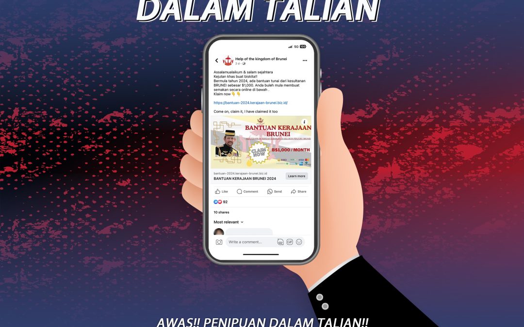 BRUNEI MUARA, Isnin 29 Jan 2024 – Pasukan Polis Diraja Brunei ingin memaklumkan dan memberi amaran kepada orang ramai tentang penipuan ’phishing’ dalam talian yang sedang berleluasa, yang memancing individu yang mudah percaya untuk mendapatkan maklumat peribadi mereka dengan menarik mereka dengan tawaran atau ‘lucky draw’ yang tidak diketahui. Untuk penipuan khusus ini, PPDB ingin menekankan bahawa kerajaan tidak akan menawarkan sebarang bantuan kepada orang ramai melalui media sosial.