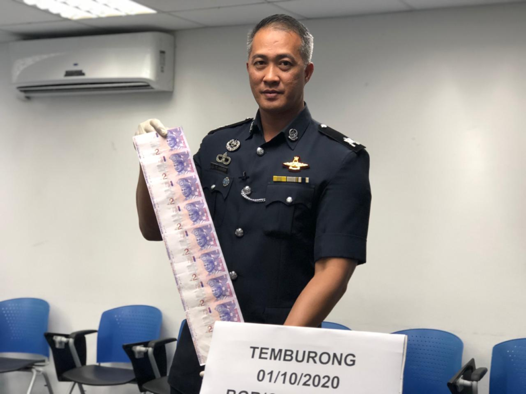 Turut ditemui sejumlah wang kertas Ringgit Malaysia bernilai RM 2 yang dipercayai wang palsu beserta peralatan dan bungkusan plastik kecil berisi pecahan kristal dipercayai digunakan untuk penyalahgunaan dadah yang telah disembunyikan di dalam kotak rokok.