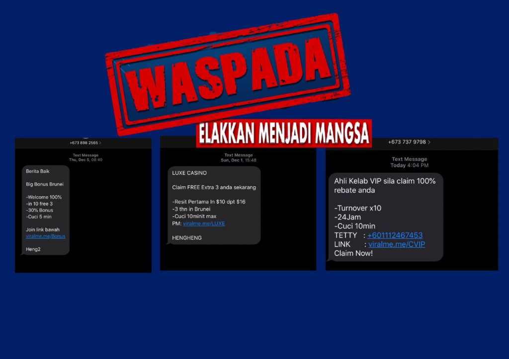 BANDAR SERI BEGAWAN, Isnin 6 Jan 2020 – Pasukan Polis Diraja Brunei (PPDB) ingin menasihatkan kepada orang ramai agar lebih berwaspada dan berhati-hati berhubung kegiatan penghantaran pesanan ringkas ‘short message service’ (SMS) yang dipercayai bertujuan untuk membuat satu penipuan ataupun scam yang sedang tular di negara ini.