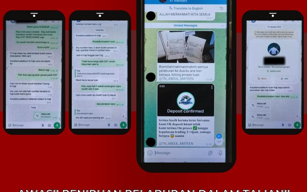 Hasil siasatan lanjut membawa kepada penemuan satu kumpulan sembang Telegram bernama “CITY INDEX STOCK MARKET”, yang disyaki digunakan sebagai platform untuk menjalankan penipuan pelaburan dalam talian. Beberapa individu tempatan yang dipercayai bertindak sebagai “keldai akaun bank” turut dikenal pasti. Jumlah kerugian serta bilangan mangsa yang terlibat masih dalam siasatan.